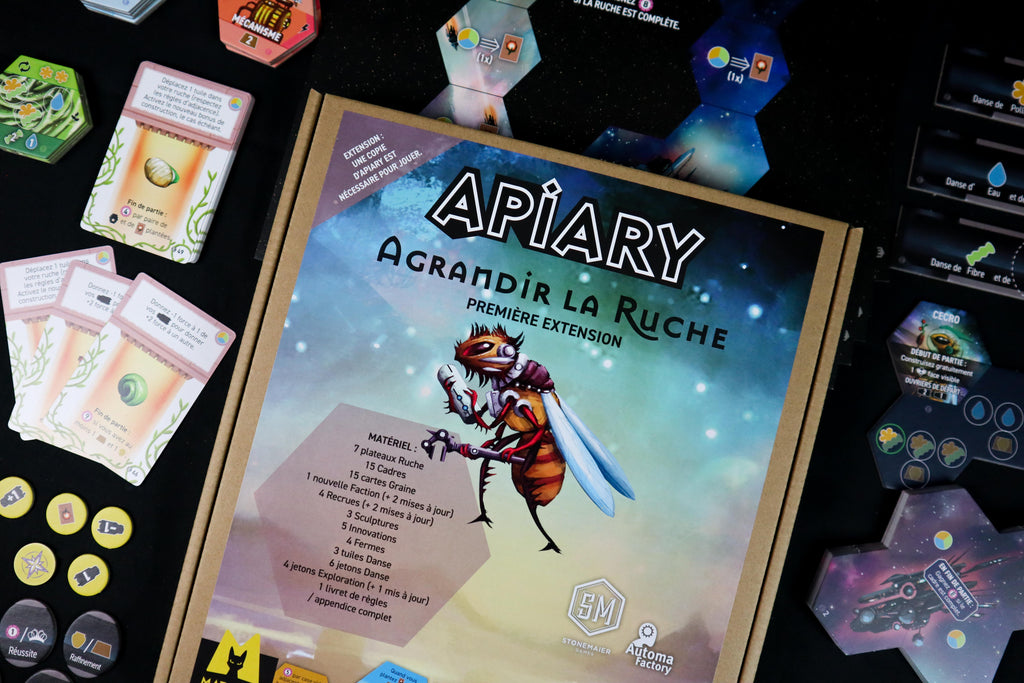 Apiary: Agrandir la ruche ajoute de la variété au jeu de base avec des composants conçus pour s'intégrer dans l'insert d'origine et une annexe complète qui couvre le jeu de base et l'extension. Cette extension comprend quelques ajouts plus importants (7 nouveaux tapis de ruche, 15 cadres uniques et 15 nouvelles cartes de graines), ainsi qu'une plus grande variété de tuiles et de jetons, et quelques composants mis à jour.