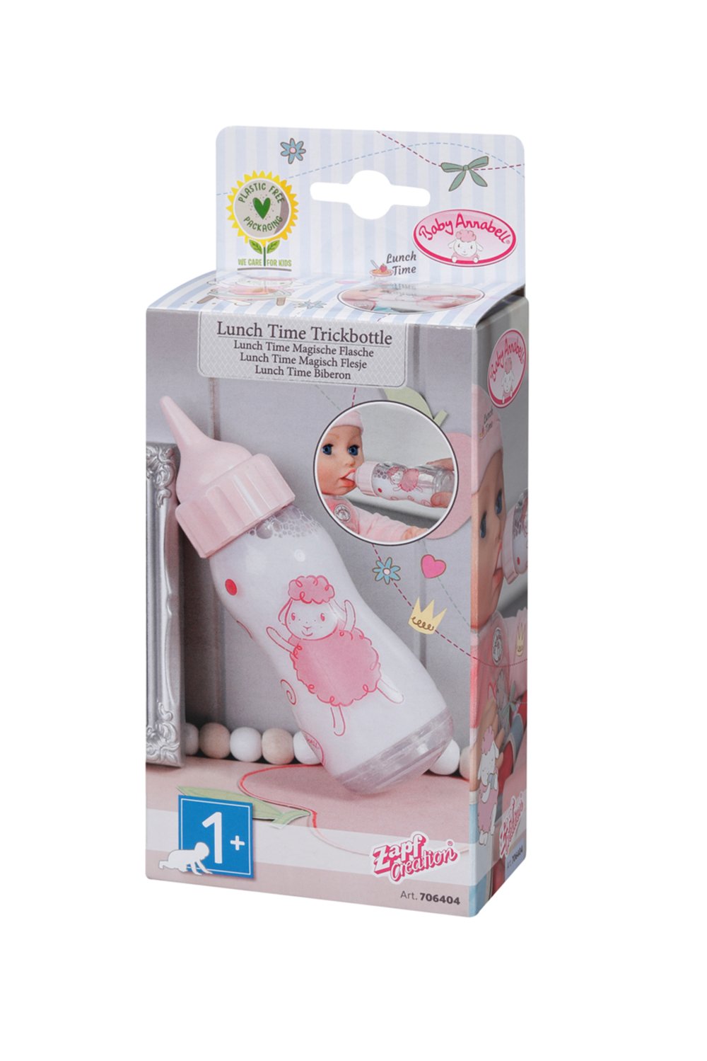 'Gulp, gulp...' Annabell looks very thirsty! As soon as you put the bottle in her mouth and hold it at an angle, the milk inside starts to flow down and down. But the bottle also fills up with milk again, as if by magic. The bottle is decorated with Baby Annabell's favorite sheep, who seems just as delighted with the milk as the little one.