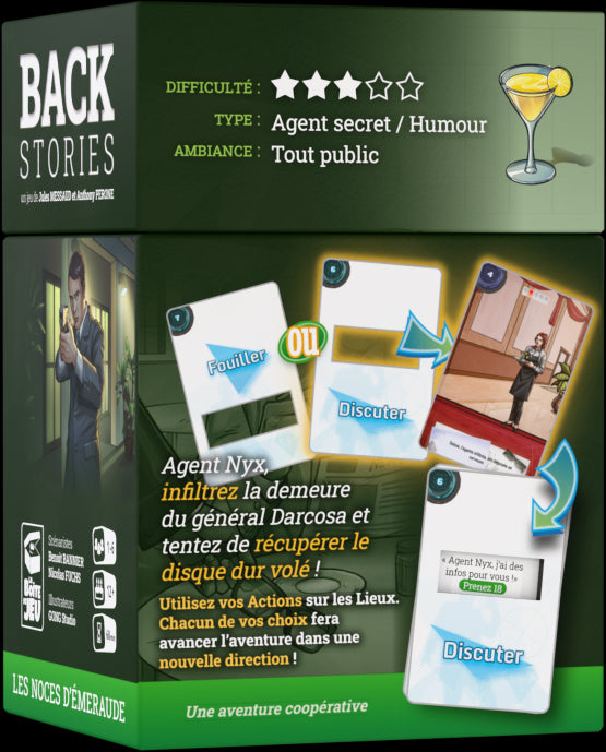 Backstories is a point & click adventure game. Choose an action (Search, Discuss, Explore, etc.) in a location, and reveal the consequences of your choice using a clever punch card system. Multiple endings are possible: Your choices, YOUR adventure!