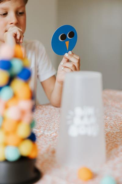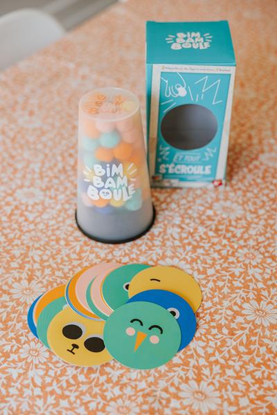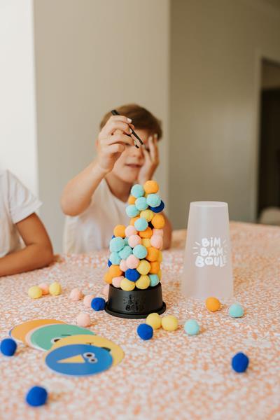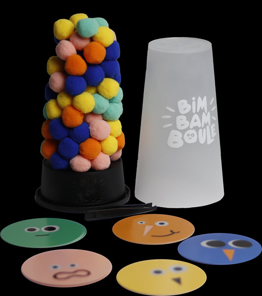 Bim Bam Boule est un jeu d'adresse dès 6 ans, dans lequel vous devrez retirez une boule en moumoute de la tour et la replacer au sommet, sans faire dégringoler la structure !