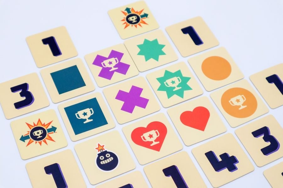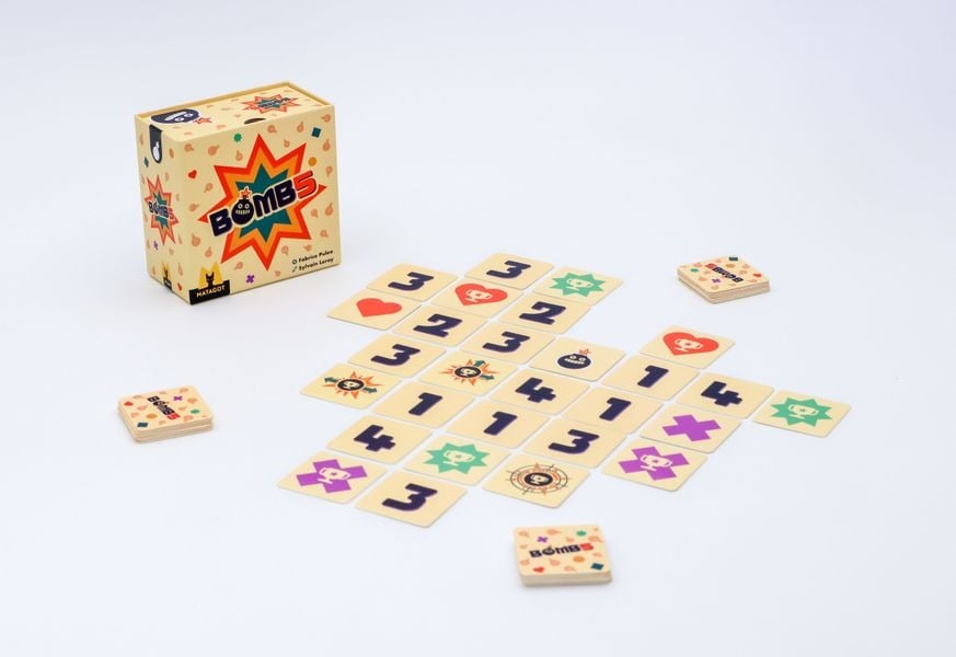 Each player starts with three numbered tiles (1 to 4). On their turn, players place one tile orthogonally adjacent to another on the playing area. If the sum of the connected numbered tiles equals 5, a chain reaction is triggered: you place one of your "cup" tiles at one end of the line and flip the tile at the other end, whether it's a cup... or a bomb. Be the first to place 5 cups face up to win!