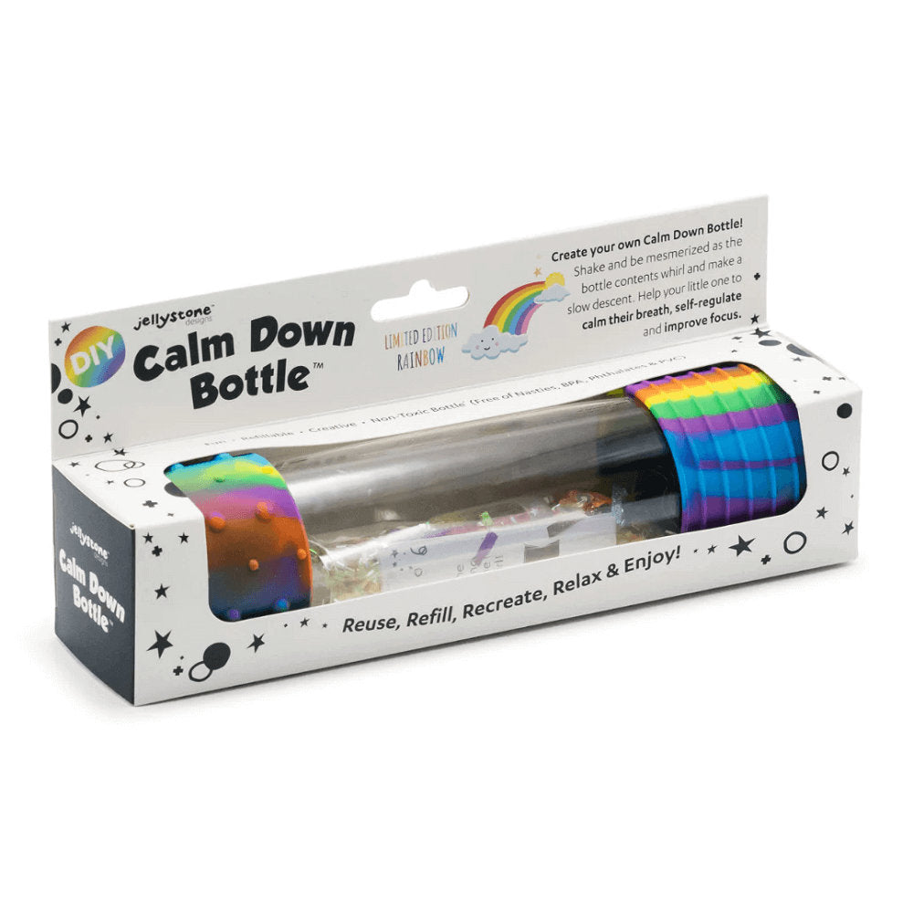 The award-winning DIY Calm Down Bottle from Jellystone Designs is a unique sensory bottle that comes with all the creative elements needed to create the perfect sensory bottle for your child. Just add water and you're done! This option allows you to refill and reuse the sensory bottle for endless creative options. Dimensions: 21 cm x 5 cm diameter: 21 cm x 5 cm diameter.