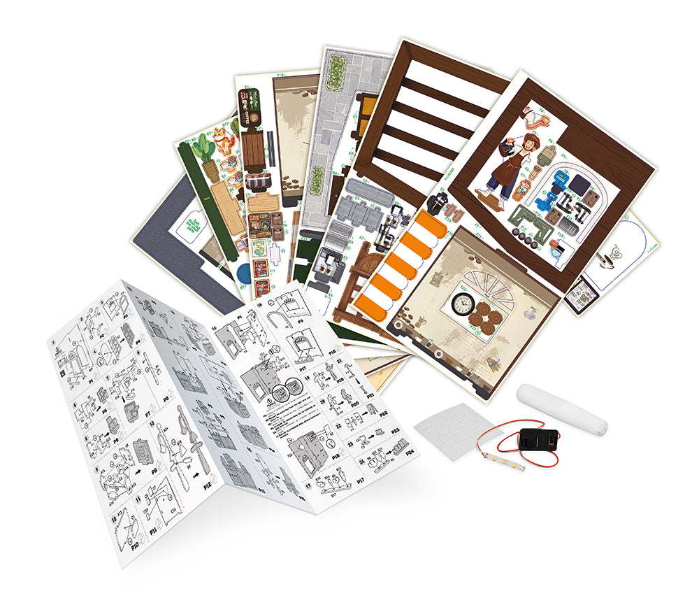 Colle, découpe et place le mobilier, les accessoires, les plantes et les clients pour recréer l’ambiance cosy des cafés.