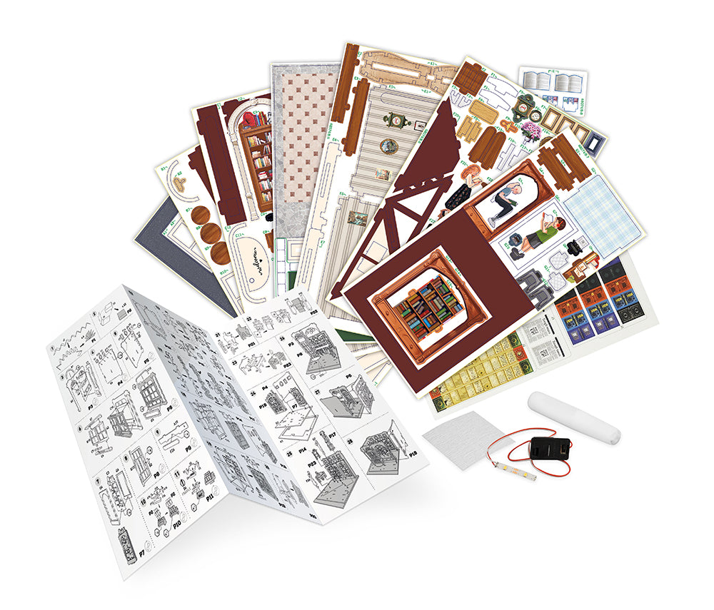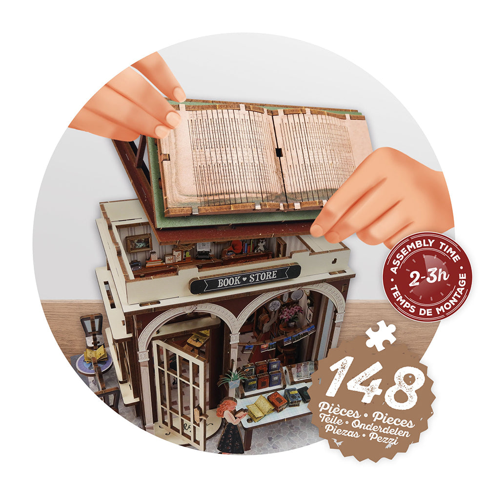 Assemble les pièces en bois et construis ta librairie miniature.