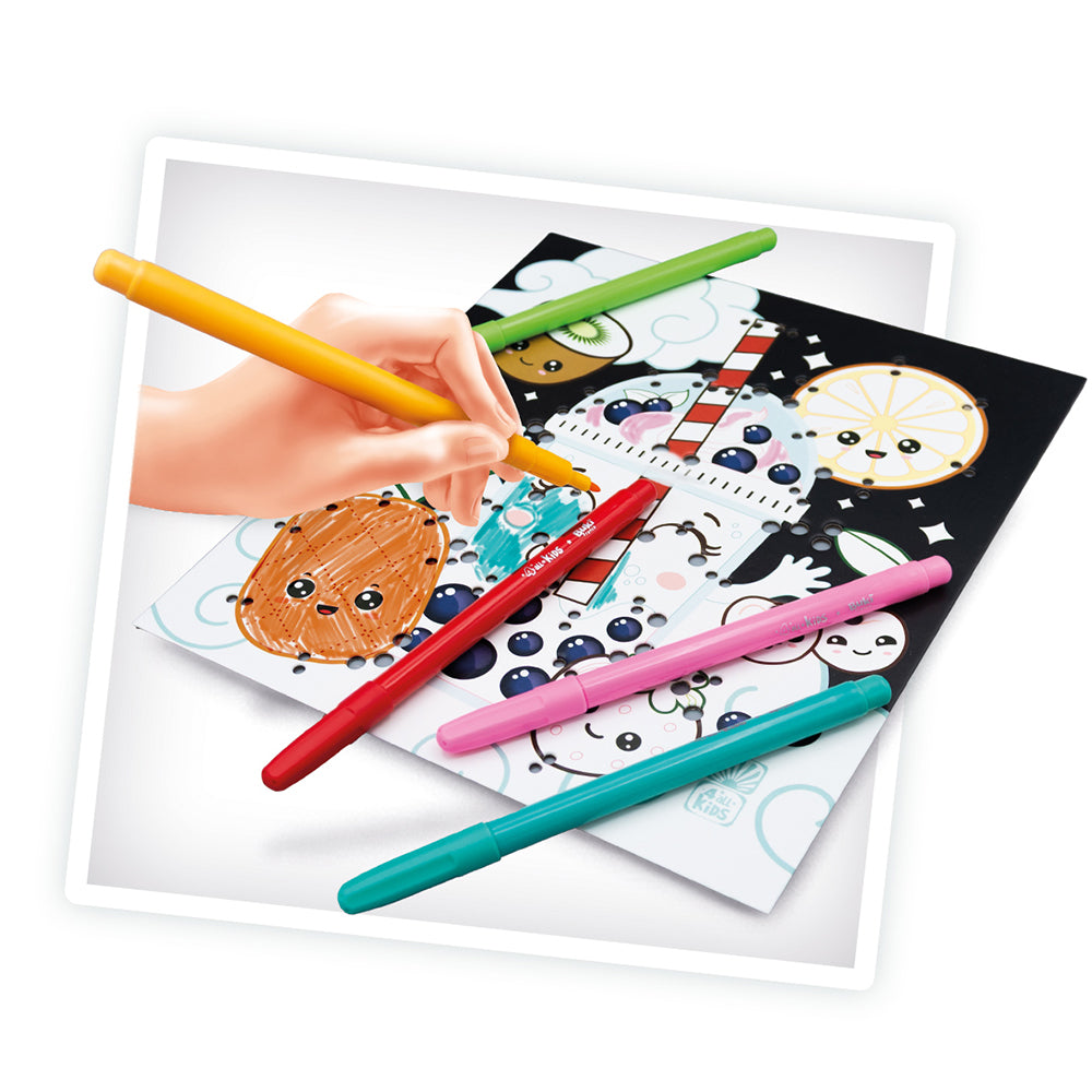 Colorie avec les feutres, passe le fil néon en suivant le schéma et place le tableau dans le cadre.