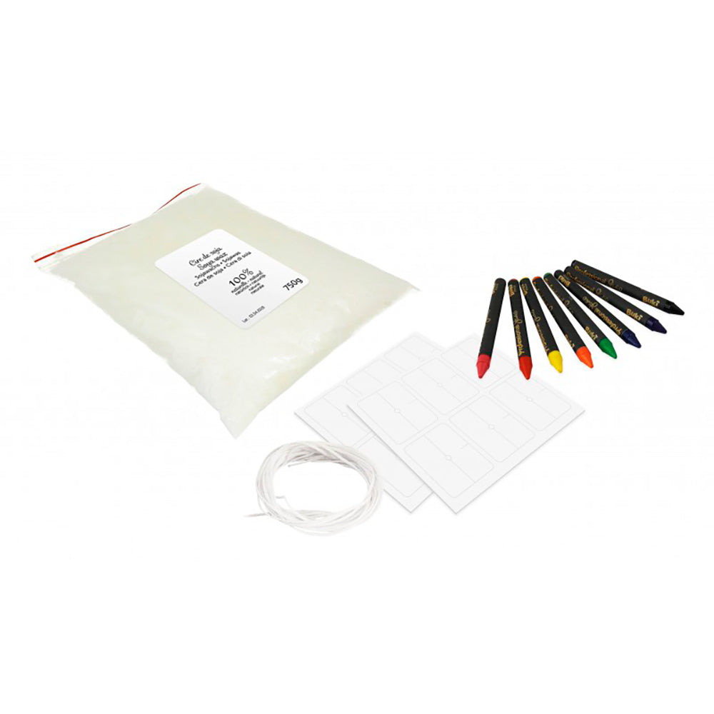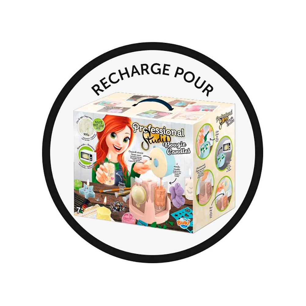 Un rouleau de mèche en coton est également inclus. La cire peut être utilisée avec le coffret Professional Studio Bougie.