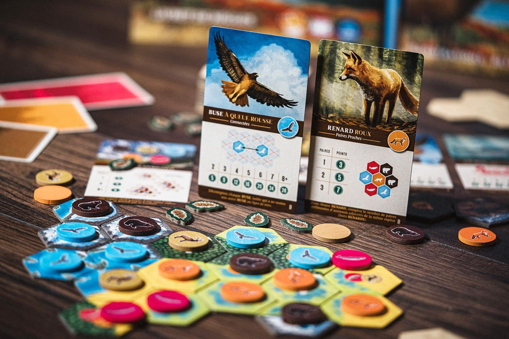 Les joueurs doivent ainsi créer un écosystème diversifié et harmonieux car chaque espèce possède des préférences de zone, et chaque habitat doit être placé judicieusement pour réduire la fragmentation et scorer du mieux possible. Cascadia propose un puzzle en 2 temps qui évoluent au fil du temps au fur et à mesure que les habitats et la faune sont ajoutés à l’écosystème de chaque joueur. Les joueurs marquent des points en créant les espaces fauniques les plus harmonieux,mais aussi les plus larges.