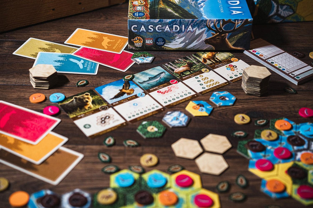 Cascadia est un jeu à base d’assemblage de tuiles et de draft de jetons mettant en scène les habitats et la vie sauvage du Nord Ouest du Pacifique. Au fur et à mesure des tours, les joueurs construisent leur propre zone de terrain et la peuplent avec la faune disponible.