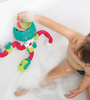 More inventive: attached to the wall of the bathtub, the toy can be used as soon as baby can sit in a bath ring.