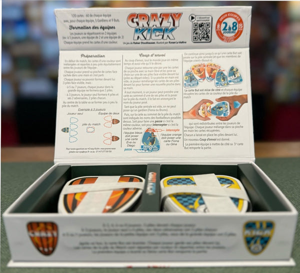 Crazy Kick est un jeu frénétique, en équipe, jouable jusqu’à huit. Les joueurs posent leurs cartes une par une, simultanément, sur une des trois piles devant eux.