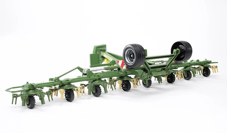 Working in the most effective way possible is of increasing importance in all areas of agriculture. The Krone trailer totary tedder with separate running gear KWT 8.82 sets the new standard when it comes to grassland cultivation. Thanks to its specially developed beam design, it can also be combined with small tractors and used to cultivate operating widths that are particularly wide. BRUDER's model of this tedding machine has been modelled on the original down to the finest detail and can be combined with all tractors of the Profi series. Just as in the original, the beam holding the implements can be folded in several places and the road carriage that is folded up during work in the fields can be swivelled down. This ensures quick and safe transport on the road from the work site to the farm and vice versa. The model sets itself apart by its individually powered implements which counter-rotate in pairs just as in the original. The counter-rotating implement tines (rotating clockwise and counterclockwise) have been painted in different colours by Krone. True to our motto "just like the real thing", we have retained this colour coding in the model.
