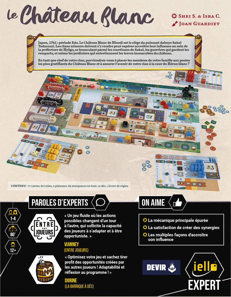 Dans Le Château Blanc : Duel , deux clans s’affrontent pour exercer leur influence à la cour du Héron Blanc, en gérant les ressources et en faisant preuve de stratégie.