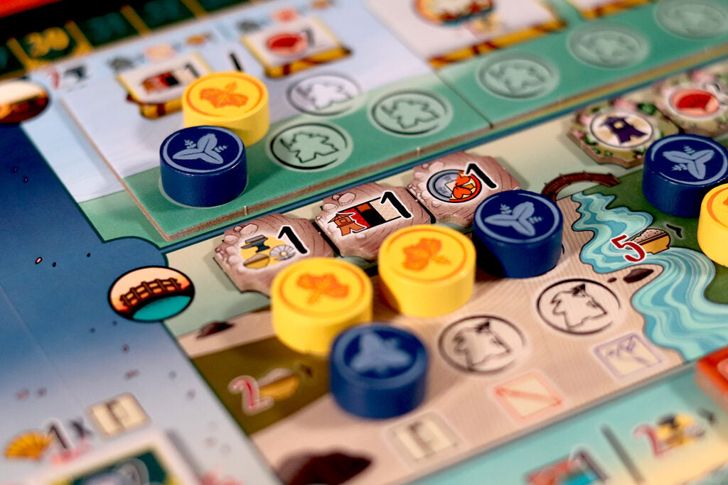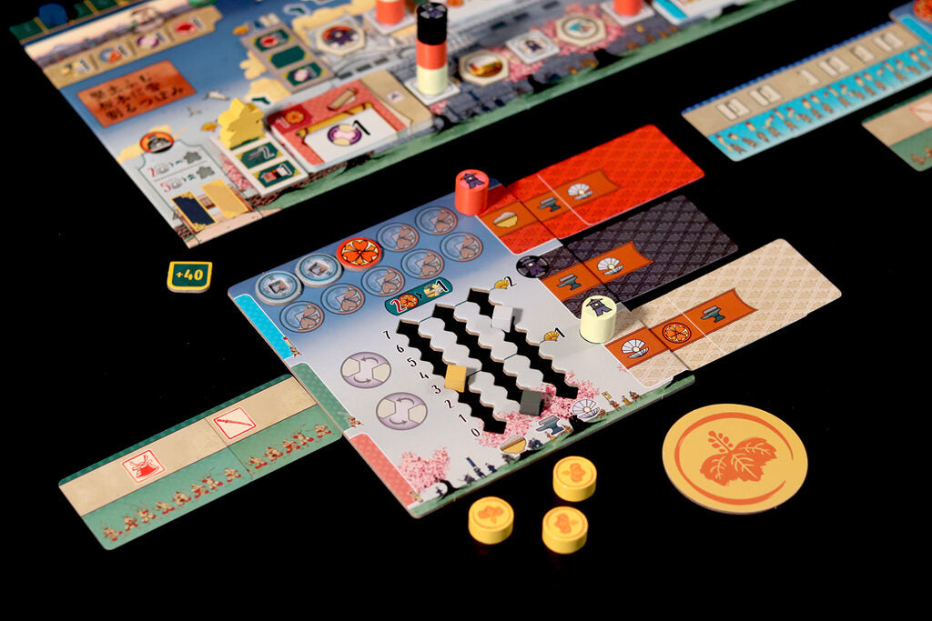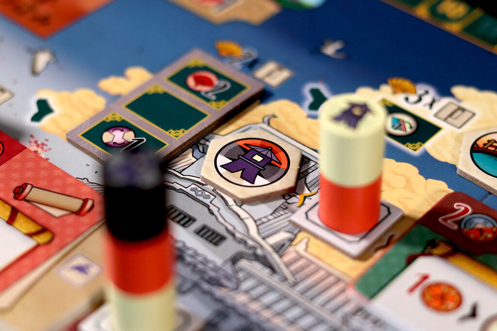 À chaque tour, vous utiliserez leurs jetons Lampe pour obtenir des ressources et activer des actions. Parmi les actions disponibles, vous pouvez acheter et améliorer des cartes Influence, placer des sceaux de clan sur les jardins et les terrains d’entraînement, déplacer votre courtisan entre les cercles d’influence ou commercer avec les Portugais. Ces actions vous permettront d’accumuler une série d’icônes – drapeaux, katanas, kabutos et origamis – qui vous rapporteront des points. Le vainqueur est celui qui en obtient le plus.
