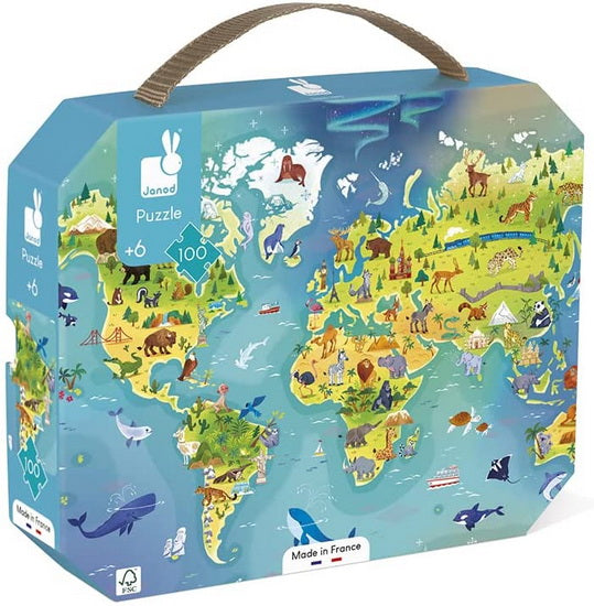 De New-York à Hong-Kong, parcourez la Terre à la rencontre des animaux et merveilles de notre planète. Ce superbe puzzle en carton de 100 pièces aux nombreux détails et idéal pour les jeunes passionnés de géographie et d'aventure. Votre enfant développera mémoire et dextérité, avec ce beau puzzle en carton de 100 pièces. Dans sa jolie valisette, ce puzzle sera facile à transporter grâce à sa poignée en tissu. Contient un poster servant de modèle pour les débutants, les plus aguerris pourront ensuite réaliser le puzzle en toute autonomie.
