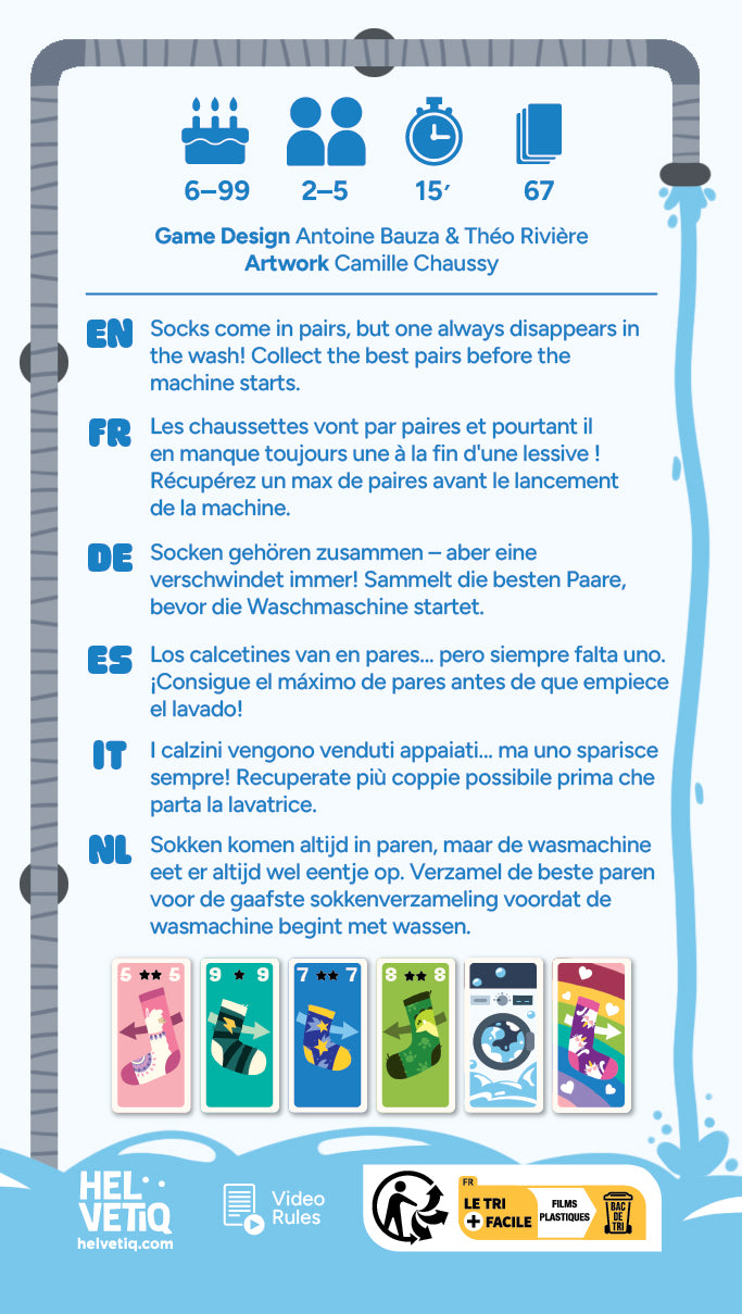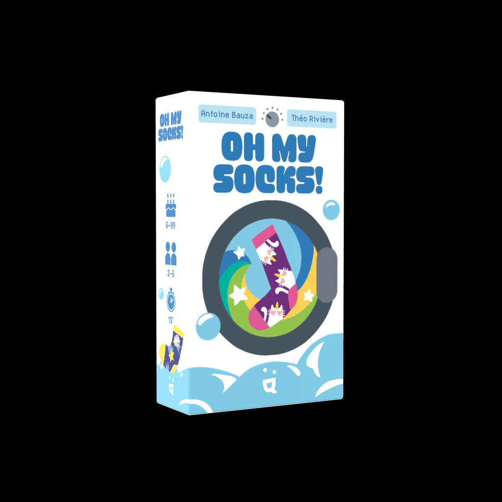 Dans le jeu Oh my socks, vous vous affronterez pour créer la plus belle collection de chaussettes en rassemblant des paires assorties. À chaque tour, piochez deux cartes et choisissez-en une que vous garderez tout en donnant l'autre à un voisin. Attention aux effets spéciaux qui peuvent bouleverser le jeu ! Seules les paires de chaussettes égales vous rapporteront des points, alors planifiez bien vos actions.