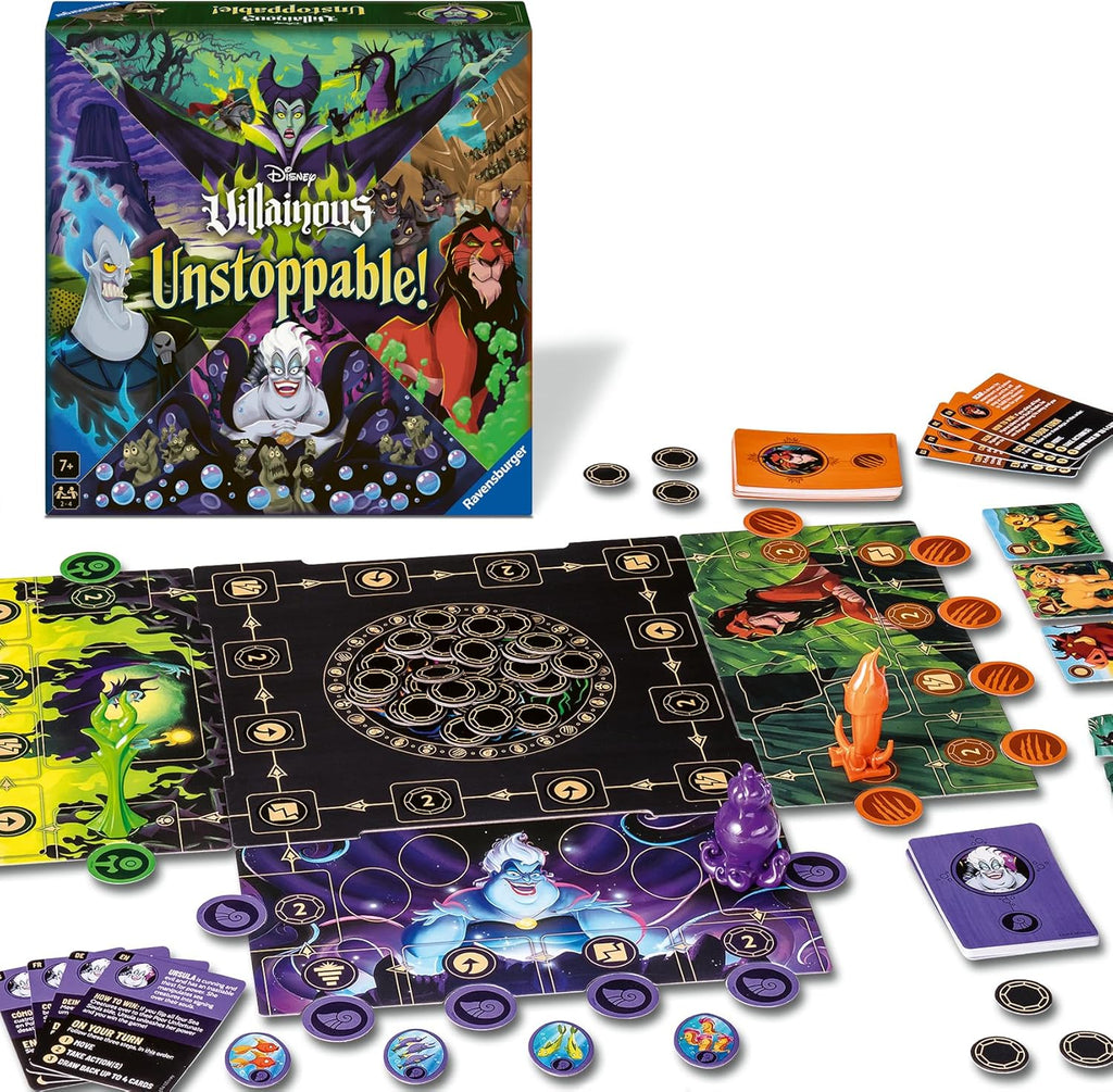 Dans ce jeu familial, incarnez l’un des quatre Méchants emblématiques de l’univers Disney – Ursula, Hadès, Maléfique ou Scar – et poursuivez votre propre objectif maléfique. Faites triompher votre noir dessein avant les autres pour remporter la victoire !