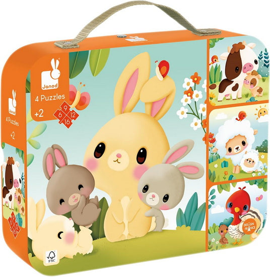 Rendez visite aux animaux de la ferme ! Avec ce lot de 4 puzzles évolutifs, votre enfant dès 2 ans enrichit son vocabulaire et développe logique et motricité, le tout bercé de tendres illustrations. La particularité de ces 4 puzzles en carton, c’est leur nombre de pièces : ils sont évolutifs, allant de 6 à 16 pièces ! Ainsi, bébé peut prendre le temps de progresser tout en se familiarisant avec les animaux de la ferme. Un cadeau idéal pour aider votre enfant à développer sa motricité fine pas à pas, en passant d’un puzzle de 6 à 9 pièces, puis de 12 à 16 pièces : il sera ravi de voir qu’il progresse ! Et pour qu’il puisse profiter de ses puzzles en toute autonomie, votre tout-petit pourra s’aider de la couleur présente au dos de chaque puzzle pour mieux les associer.
