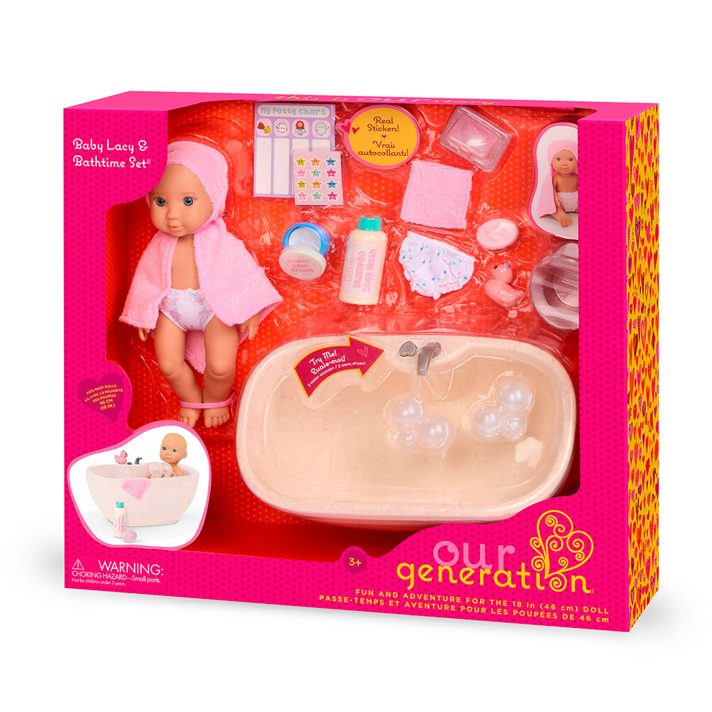 Plouf, éclaboussez et donnez un bain à bébé avec le coffret Our Generation Baby Lacy et son bain! Cet adorable ensemble de jeu offre aux enfants tout le nécessaire pour prendre soin de la poupée Lacy. Prêts pour le bain? Appuyez sur le bouton de la baignoire pour entendre l'eau couler et « remplir » la baignoire. Une fois Lacy dans la baignoire, ajoutez les bulles de bain et le canard en plastique pour encore plus de plaisir. Appuyez ensuite à nouveau sur le bouton pour activer un bruit d'éclaboussures et profiter d'un jeu de rôle réaliste! Un pot et un tableau d'apprentissage de la propreté aident les enfants à acquérir les bonnes habitudes d'hygiène, de la chasse d'eau au lavage des mains. De plus, la planche d'autocollants incluse leur permet de marquer fièrement chaque progrès! Des accessoires thématiques comme la serviette à capuche, le gant de toilette, la crème pour le change, le shampoing, le savon, les lingettes pour bébé et les couches complètent l'ensemble et enrichissent les histoires. Un ajout élégant aux maisons de poupées et aux ensembles de meubles pour poupées.
