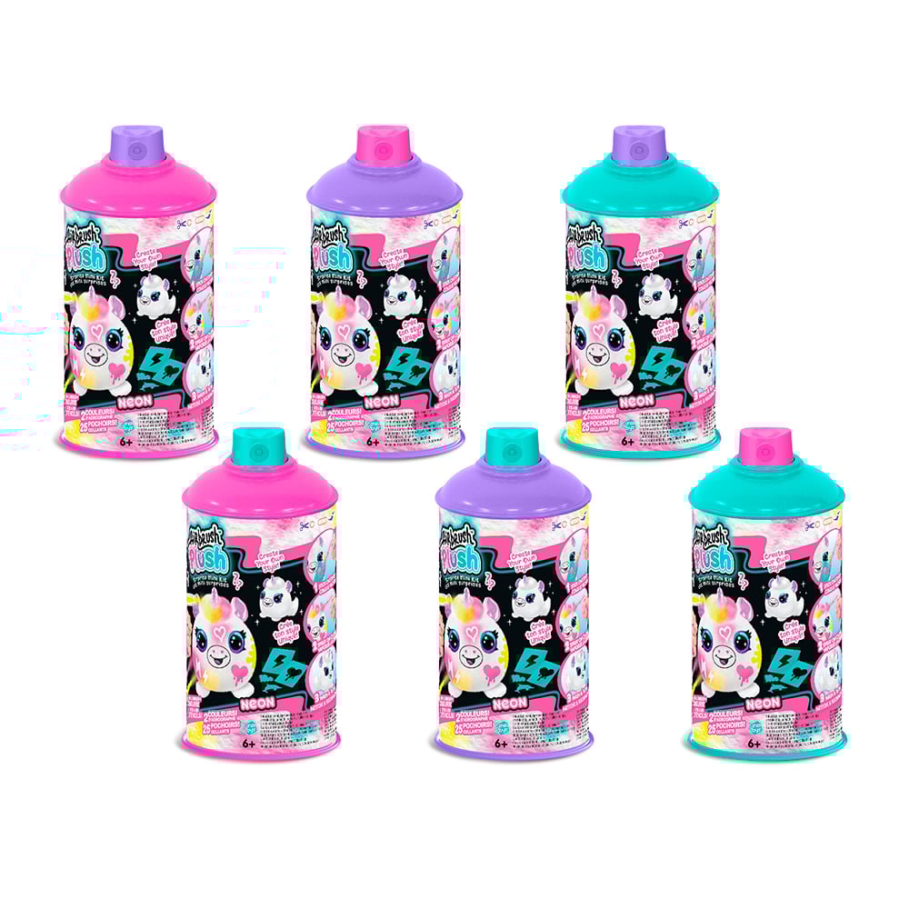 Bombe aérosol avec un personnage en peluche surprise de 8,9 cm à l'intérieur. L'animal en peluche est doux, avec des oreilles et des accents de couleur argentés. Utilise les pochoirs et les couleurs pulvérisées pour personnaliser ton design. Lave et répète encore et encore. Collectionne-les tous, 6 personnages au total.