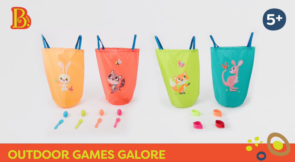 1, 2, 3, Partez! Sautez, marchez et courrez avec cet ensemble de jeux d'extérieur aussi amusants que drôles. 3 jeux, 16 pièces :