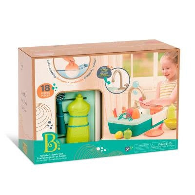 15 accessoires : Cet évier jouet est livré avec 2 assiettes, 2 tasses, 2 fourchettes, 2 couteaux, 2 morceaux de nourriture pour enfants, une passoire, un support pour évier, une brosse à récurer, du savon à vaisselle et une fleur décorative.