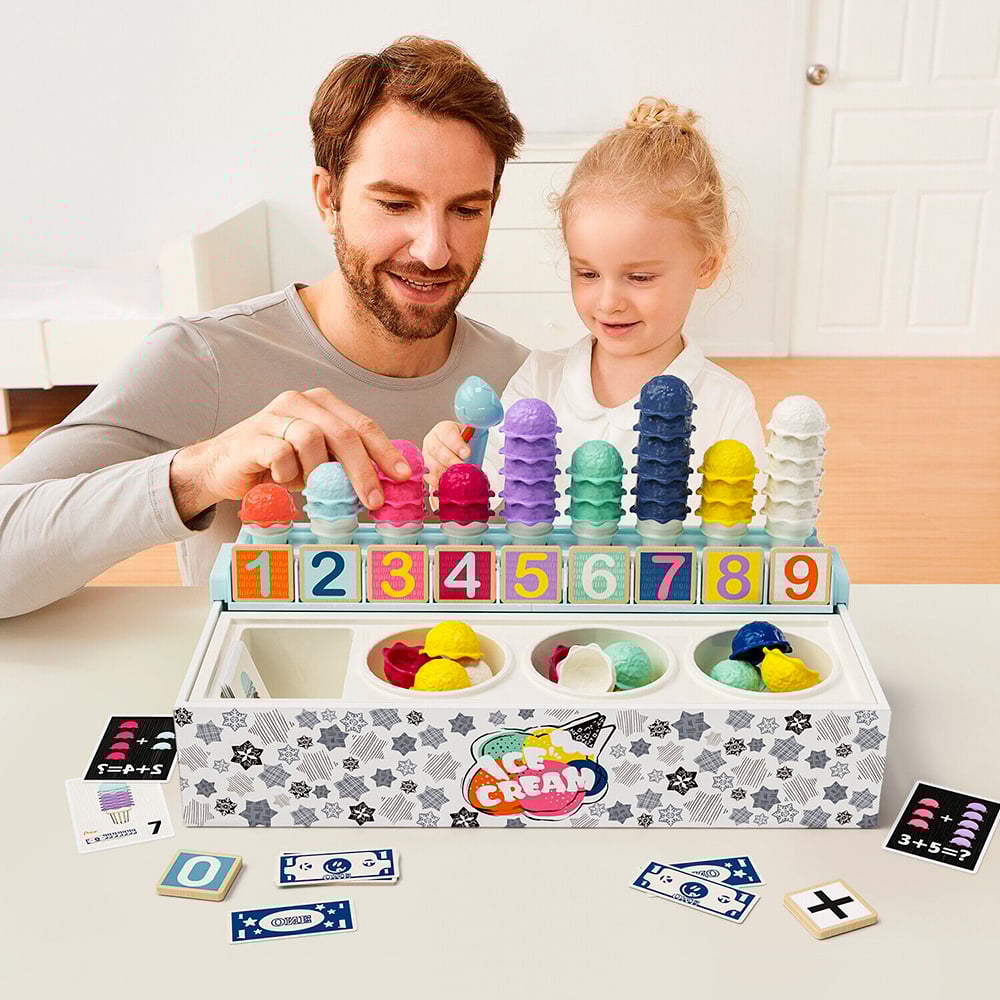 La boîte d’apprentissage Magasin de glaces est un jouet amusant et éducatif qui permet aux enfants de gérer leur propre magasin de crème glacée. Les tout-petits peuvent trier les boules de glace par couleur et découvrir les différentes formes, tandis que les enfants plus âgés peuvent se familiariser avec le monde des nombres en résolvant des exercices de mathématiques à l’aide des menus fournis. Avec des accessoires tels que de l’argent fictif et des menus détaillés, les enfants peuvent également développer leurs compétences en lecture et en calcul. Ce jouet stimulant favorise la créativité et l’imagination, tout en offrant des heures de plaisir gourmand. Les enfants adoreront servir leurs propres créations de crème glacée et apprendre en même temps!