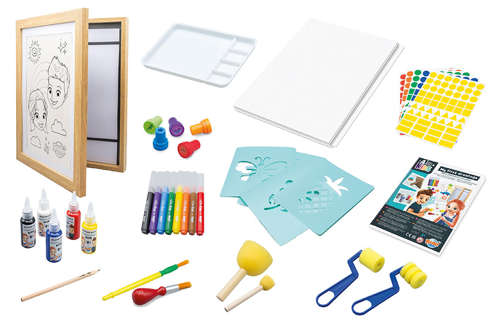 Comprend : Un cadre A4, 8 feutres à mine ronde, 5 tampons, 5 flacons de peinture, une palette, 2 rouleaux en mousse, 2 tampons en mousse, 2 pinceaux, 5 pochoirs, 5 planches de gommettes, 10 feuilles 200g format A4.