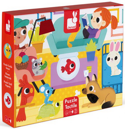es enfants vont adorer ce puzzle tactile géant sur le thème des animaux domestiques. Ils feront travailler leur sens en touchant et en découvrant les matières et couleurs placées sur les animaux et les objets : pelage pour le chien, le lapin, imitation écaille pour la tortue, effet pailleté pour le perroquet, effet texturé pour la plante et la lampe, effet molletonné pour les pelotes de laine. Contient un poster servant de modèle. Puzzle : 65 x 50 cm. Nombre de pièces : 20, 7 pièces texturées.