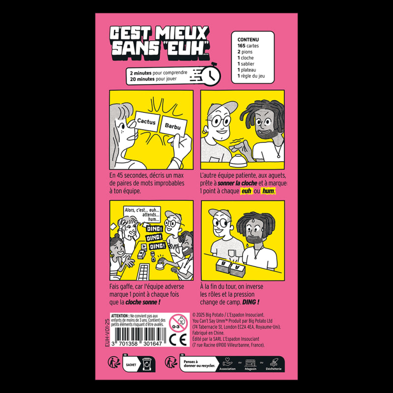 Deux équipes s’affrontent pour amener leurs pièces au bout du plateau. Ils le feront en décrivant autant d’objets étranges que possible, à partir des cartes aléatoires qu’ils ramassent. Un seul problème : vous ne pouvez pas dire « euh ». Chaque fois que vous le faites, l’autre équipe sonne la cloche et rapproche sa pièce de la victoire, augmentant ainsi la pression et le suspense ! À mesure que chaque équipe se rapproche de la fin, de plus en plus de sons deviennent interdits, ce qui en fait une course effrénée vers la ligne d’arrivée !