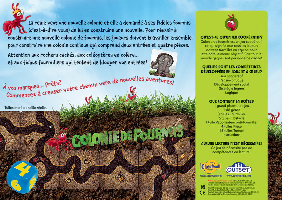 Colonie de fourmis est plein de plaisir coopératif. Les joueurs doivent surmonter des obstacles alors qu'ils travaillent ensemble pour construire une colonie de fourmis. Faites juste attention aux rochers cachés, aux coléoptères en colère et aux fourmiliers embêtants !