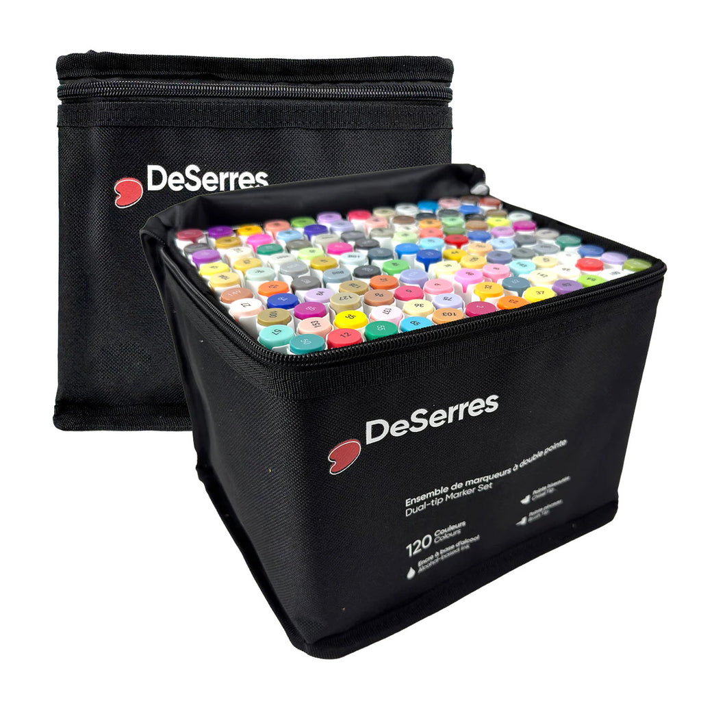 Toute la richesse des couleurs à portée de main ! Avec 120 marqueurs à double pointe, cet ensemble répond à toutes vos ambitions créatives. Passez aisément de la pointe pinceau qui permet des tracés expressifs et des dégradés subtils, à la pointe biseautée parfaite pour les aplats et les contours nets. Leur encre à base d'alcool garantit des couleurs vibrantes, un séchage rapide et un mélange fluide. Inclus : un mélangeur incolore et un étui robuste pour un rangement pratique. Caractéristiques principales : • 119 couleurs + 1 mélangeur incolore • Pointe pinceau pour dégradés subtils et lettrage • Pointe biseautée pour aplats uniformes • Encre à base d'alcool : séchage rapide, mélange homogène • Capuchons codés par couleur • Étui en tissu résistant