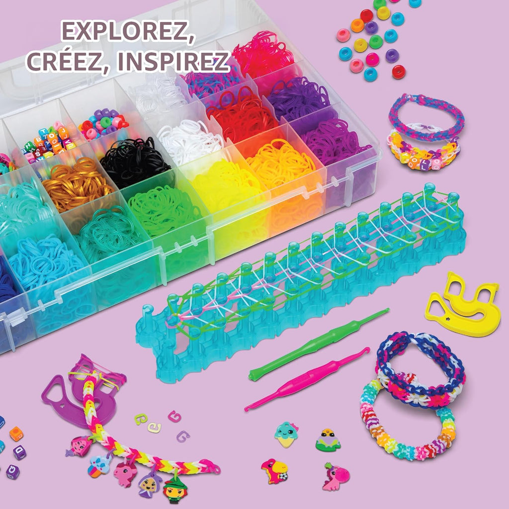 Le kit Loomi-Pals Mega Combo des fabricants de Rainbow Loom offre beaucoup de valeur et de plaisir! Faites passer vos designs de bracelets élastiques au niveau supérieur. Le kit Combo comprend 1 Rainbow Loom 2.0, 2x Happy Looms, 60 adorables breloques Loomi-Pals, 300 perles, 300 clips en G, un crochet pour métier à tisser, un crochet pour perles, 5600 morceaux d'élastiques sans latex dans 17 couleurs populaires, 12 cadeaux sacs et instructions. Ajoutez un peu de caractère à vos créations et attachez les breloques Loomi-Pals sur n'importe quel bracelet, collier, bracelet de cheville ou création Rainbow Loom. Le kit Mega Combo est livré dans un étui de transport pratique permettant de ranger proprement tous vos composants.