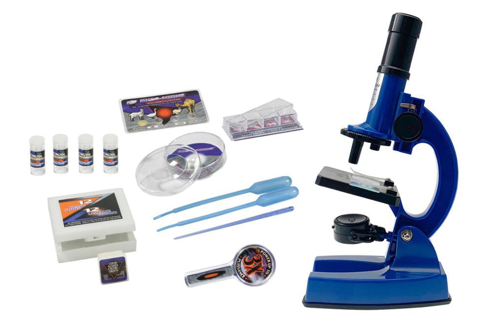 Comprend : 1 microscope 8 5/8’’ en métal avec agrandissement de 100x, 450x et 900x, 1 banque de données Micro-science®, 12 lamelles porte-préparation, 12 verres de couverture, 14 porte-étiquettes, 12 couvertures de diapositive, 4 fioles pour échantillons, 1 mélangeur, 1 boîte de Pétri, 1 loupe, 2 pipettes, 1 récipient, mode d’emploi.