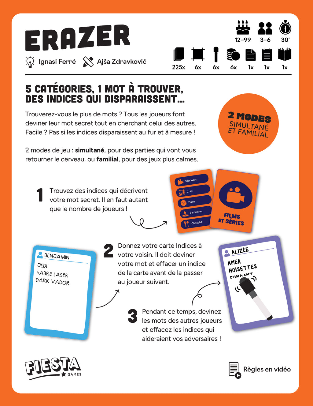 Trouverez-vous le plus de mots ? Tous les joueurs font deviner leur mot secret tout en cherchant celui des autres. Facile ? Pas si les indices disparaissent au fur et à mesure !