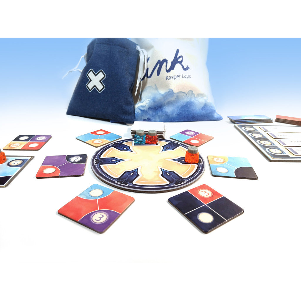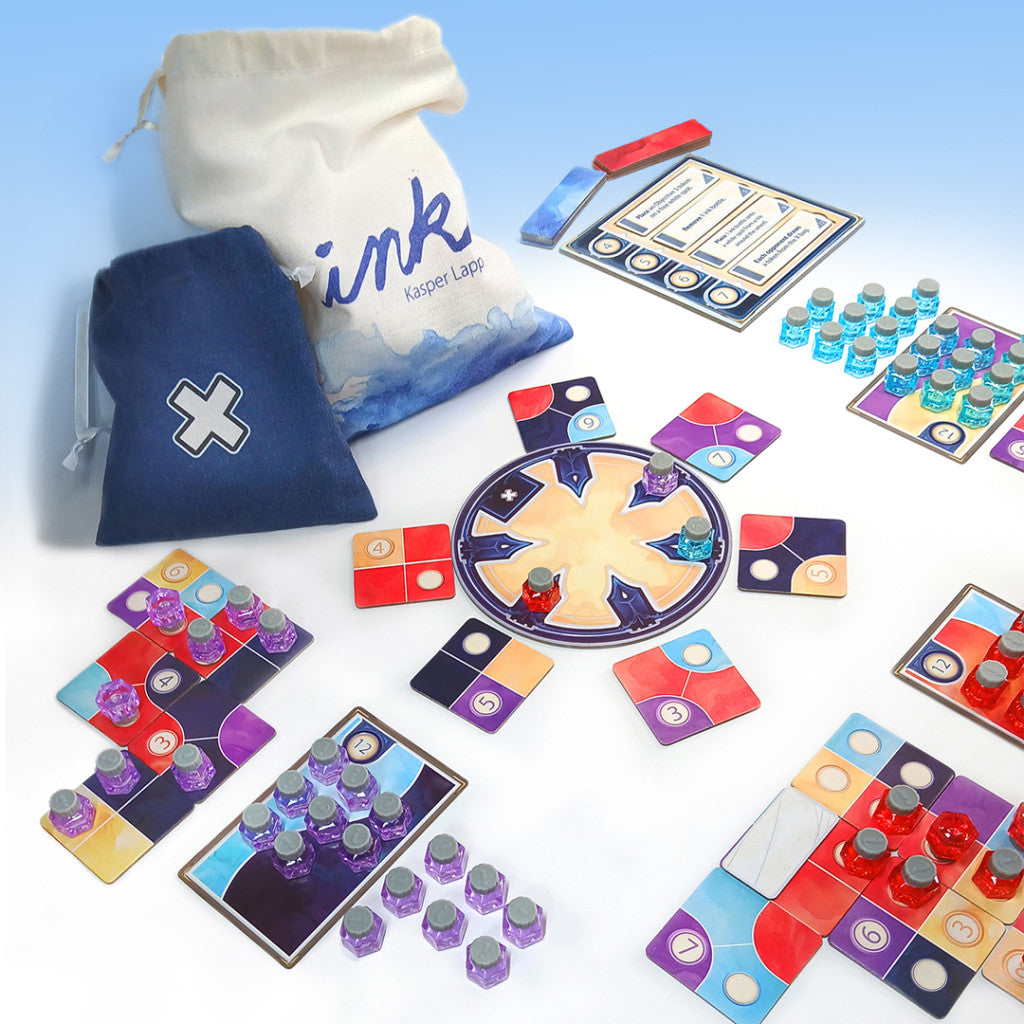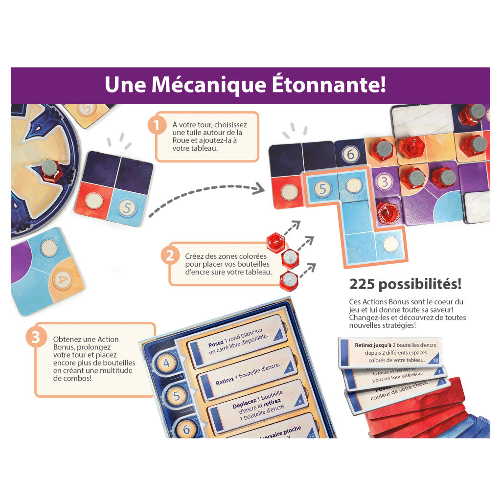 Ink, le jeu qui combine Art et Stratégie Vous rêvez d’embrasser une carrière d’artiste ? Les toiles de maître vous fascinent ? Ink est le jeu de société qu’il vous faut ! Que vous soyez joueur débutant ou expérimenté, c’est l’occasion de mesurer vos talents d’artiste, en étant le premier ou la première à utiliser toutes les bouteilles d’encre à votre disposition. Pour cela, choisissez avec soin quelle tuile ajouter à votre toile, en fonction des actions bonus à votre disposition et le tour est joué ! Diablement simple et efficace, Ink propose 225 configurations de jeu différentes, grâce aux multiples combinaisons d’actions bonus. Ces combinaisons sont au cœur d’Ink : inattendues et redoutables, elles peuvent faire basculer la partie jusqu’au dernier moment ! Ink peut se jouer comme un jeu de stratégie, en anticipant la tactique de chaque artiste à la table, mais aussi en pariant sur des combos que personne n’avait vu venir ! Vous souhaitez mettre de la couleur à votre table de jeu ? Ink s’y prête à merveille. Vous cherchez un jeu pour initier des débutants aux jeux de stratégie ? Les tours rapides d’Ink sont parfaits pour cela. Rendez-vous chez votre ludicaire éligible pour obtenir deux tuiles d’action bonus uniques, ainsi que douze anneaux jokers, pour un total de 440 possibilités différentes de jeu ! Grâce à eux, la rejouabilité d’Ink atteint des sommets ludiques et artistiques.