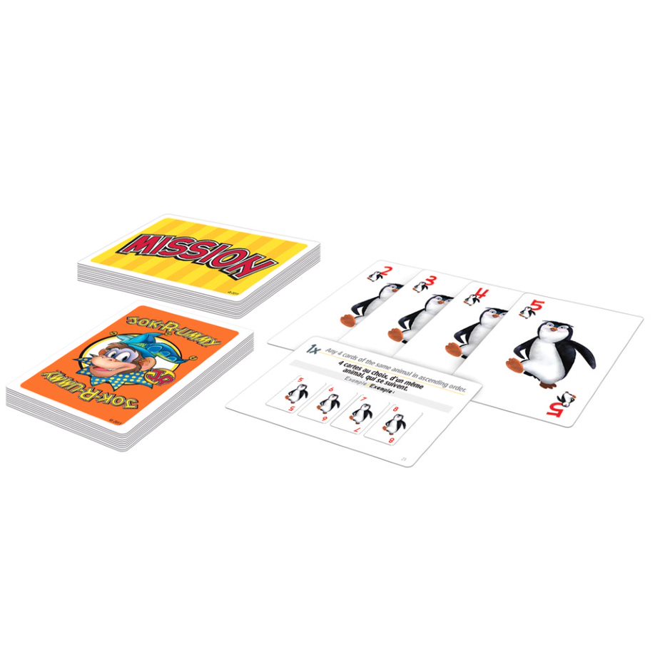 Adaptation du populaire jeu Jok-R-ummy®. Faites équipe avec Perroquet, Pingouin, Tigre et Zèbre pour accomplir vos missions. Le 1er joueur à réussir 4 missions gagne la partie. 92 cartes Jok-R-ummy JR, 38 cartes Mission.