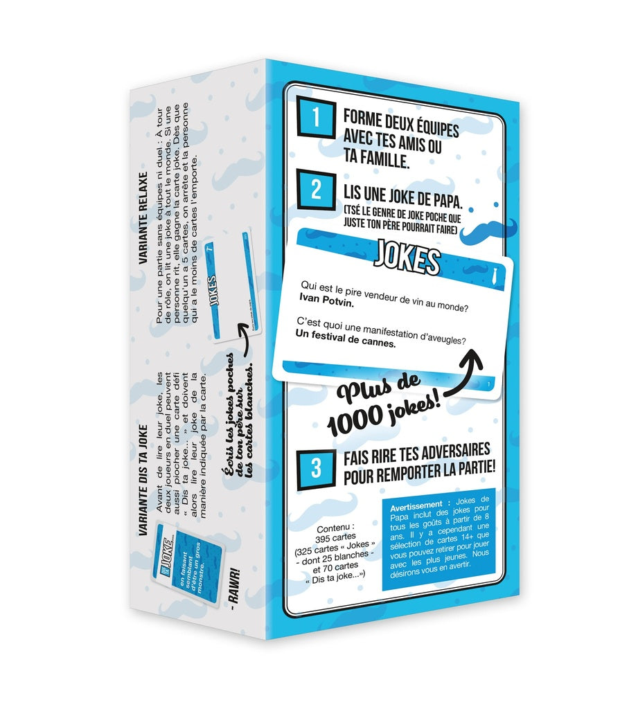 Avec plus de 1000 jokes, dont certaines si mauvaises qu’elles en deviennent cultes, ce nouveau format pratique est parfait pour les soirées, les partys et les duels à mort (de rire).