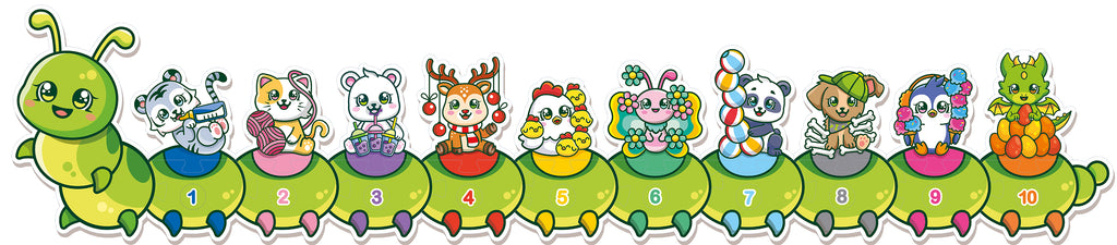 Ce casse-tête de Kikki la chenille Kioukis t’aidera à apprendre à compter et à reconnaître les chiffres de 1 à 10. Il suffit d’associer le chiffre de couleur avec le bon nombre d’objets qui entourent les amis Kioukis. "