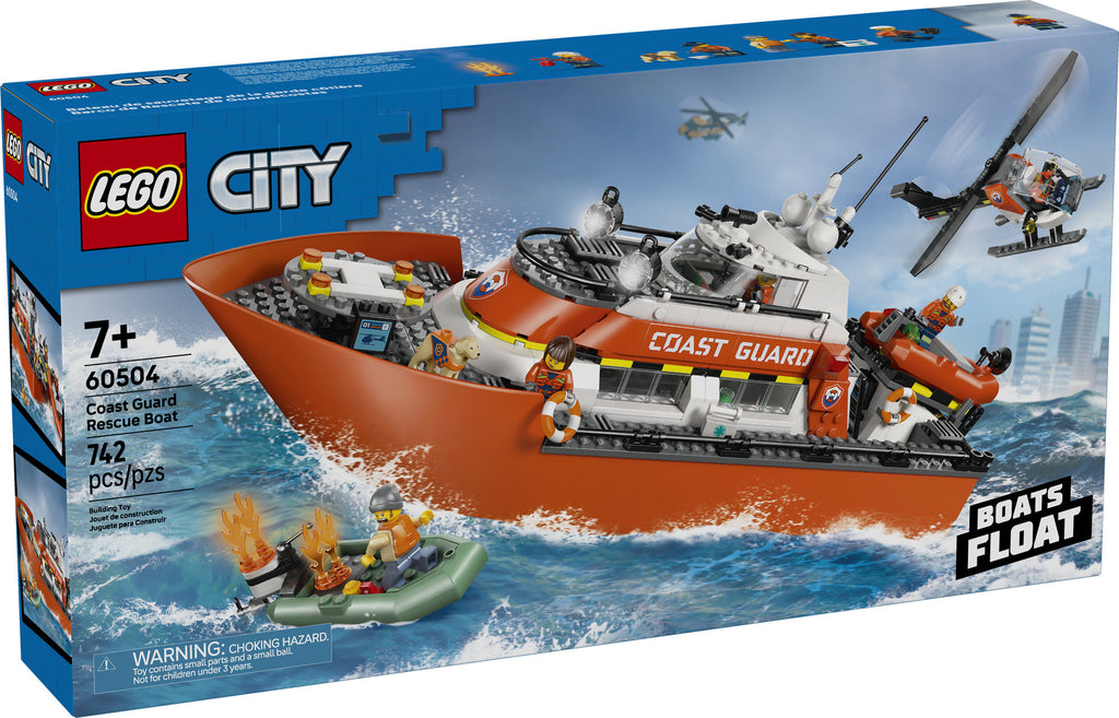 Les enfants de 7 ans et plus peuvent partir à l’aventure en mer avec l’ensemble LEGO® City Le bateau de sauvetage et l’hélicoptère de la garde côtière (60504). Ce bateau flottant riche en fonctionnalités, avec ses ponts amovibles, permet d’accéder facilement à la passerelle de commandement, aux cabines et à la cuisine. Les enfants peuvent déployer un bateau de sauvetage depuis la rampe de lancement ou s'envoler depuis l’héliport embarqué à bord d’un hélicoptère génial. L’ensemble comprend également un deuxième bateau pneumatique, des flammes LEGO, 5 figurines et un chien pour un jeu imaginatif et des histoires passionnantes. Les 3 bateaux flottent sur l’eau.