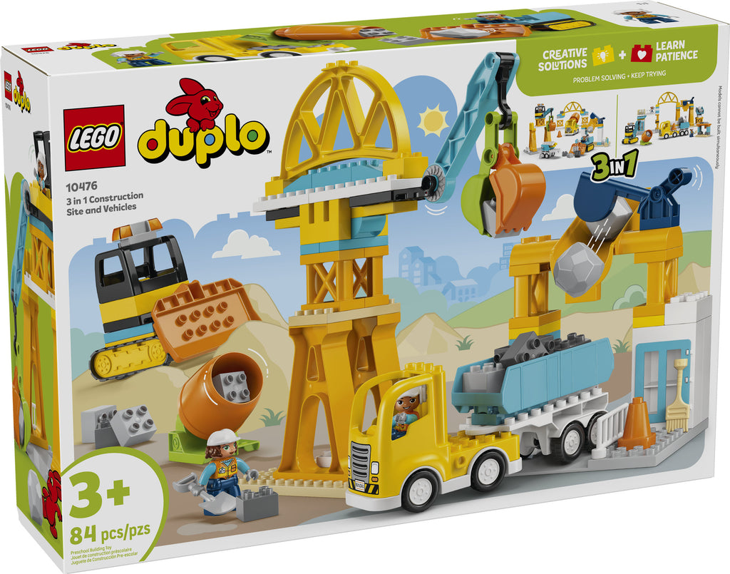Présentez aux petits constructeurs Le chantier avec véhicules 3 en 1 (10476), où la construction ne s’arrête jamais! Les tout-petits de 3 ans et plus se plongent dans un jeu de construction intense en chargeant et déchargeant les camions, et en ramassant et déplaçant les rochers et les briques avec une gamme de camions de construction LEGO® DUPLO®.
