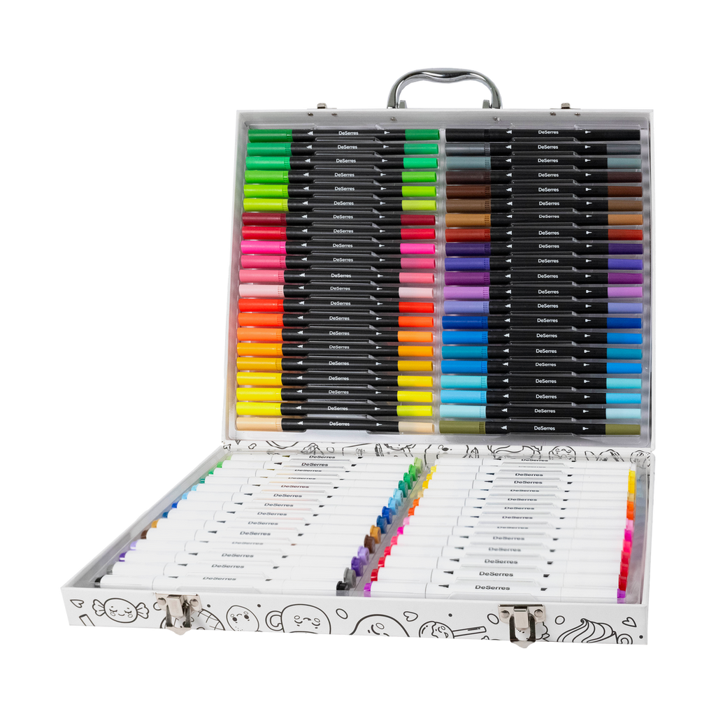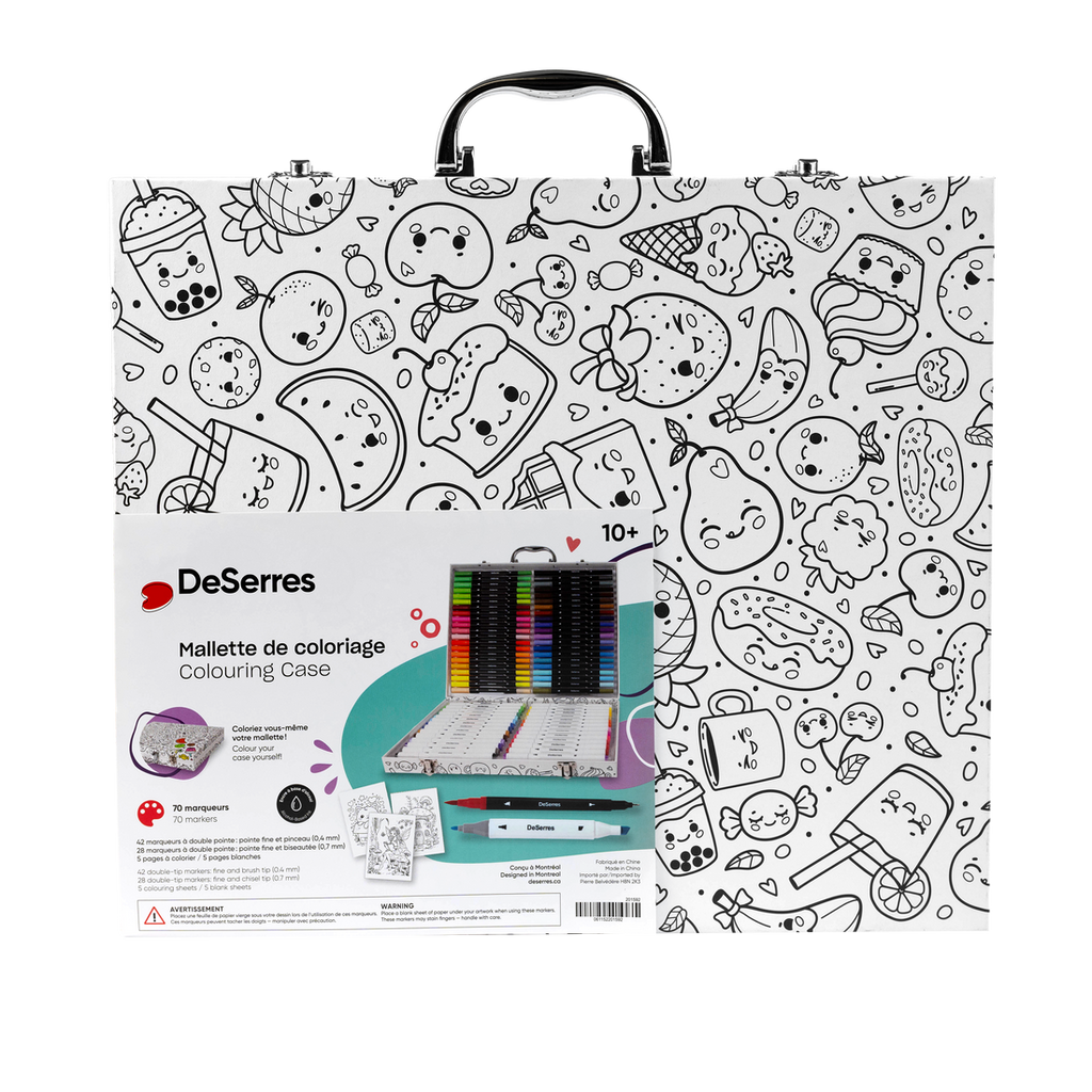 Emmenez votre créativité partout avec cette mallette de coloriage amusante et colorée de DeSerres! Remplie de 70 marqueurs à double pointe et de 10 feuilles à colorier (5 illustrées + 5 blanches), cette trousse tout-en-un offre des heures d'exploration artistique pour les enfants et les familles créatives.