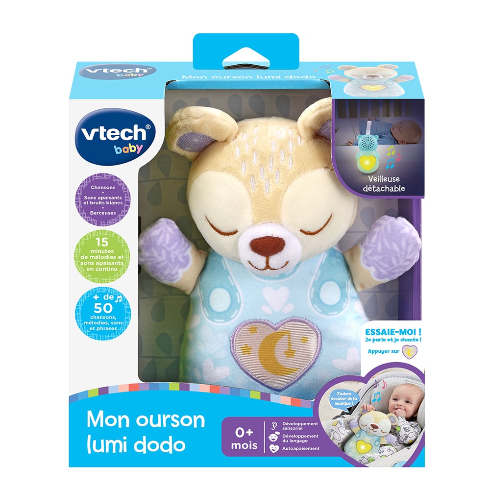 Profitez de câlins mignons, puis d'un doux sommeil avec Mon ourson lumi dodo! Le sommeil est en haut de la liste des souhaits quand il y a un bébé ou un tout-petit dans les parages. Rendons l'heure du coucher plus facile! Placez cet ours tout doux sur une commode ou une table pour diffuser des bruits blancs, des sons de la nature et un battement de coeur rassurant afin d'aider les petits à apprendre à s'apaiser. Des lumières douces accompagnent les sons et constituent une veilleuse apaisante. Appuyez sur le coeur lumineux pour changer la musique. Lorsque votre enfant se réveillera, il aura envie de se blottir contre cet ourson câlin. Grâce à la veilleuse amovible, cet ours multifonctionnel peut être facilement mis dans la machine à laver. C'est facile. Ce jouet à emporter se glisse dans un sac à langer pour aider bébé à dormir partout où il va! Conçu pour les enfants à partir de la naissance. Nécessite 2 piles AAA. Piles incluses à des fins de démonstration uniquement. Des piles neuves sont recommandées pour une utilisation régulière.