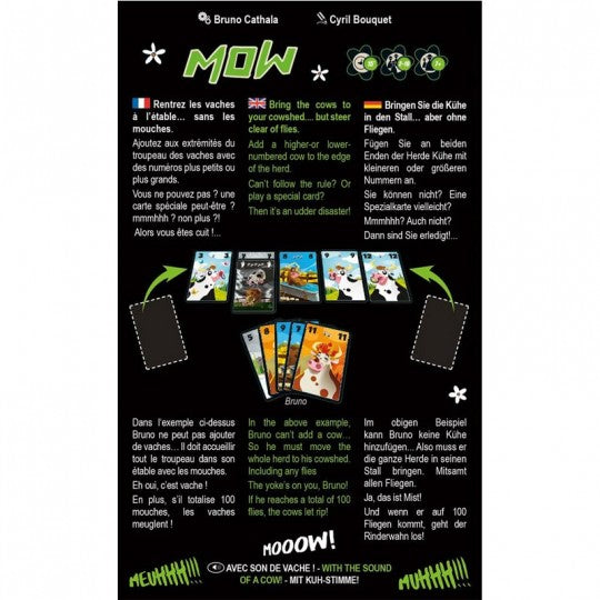 À la fin de chaque manche, on totalise et on recommence une nouvelle. La partie se termine dès qu’un joueur cumule au moins 100 mouches. Le joueur avec le moins de mouches dans son étable est déclaré vainqueur! Simple, rapide et fun, MOW permet de rassembler jusqu’à 10 joueurs autour de la table et ravira autant les enfants que les adultes, novices ou experts en jeux de société.