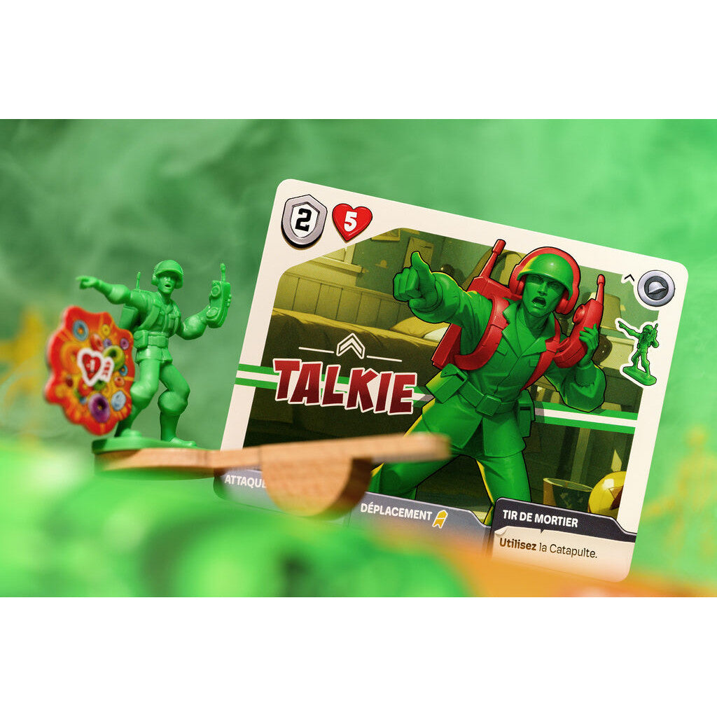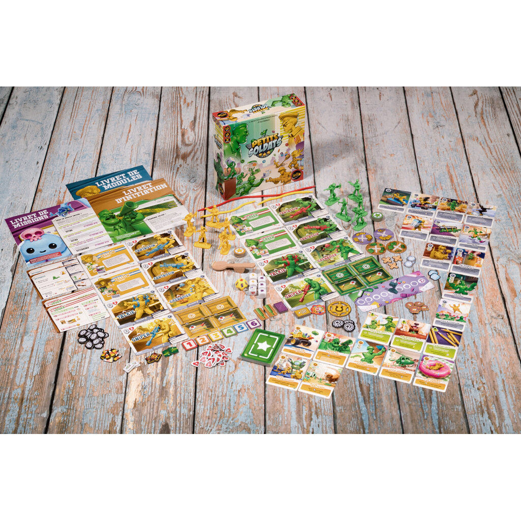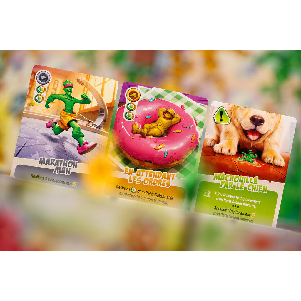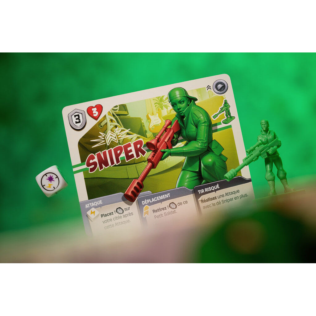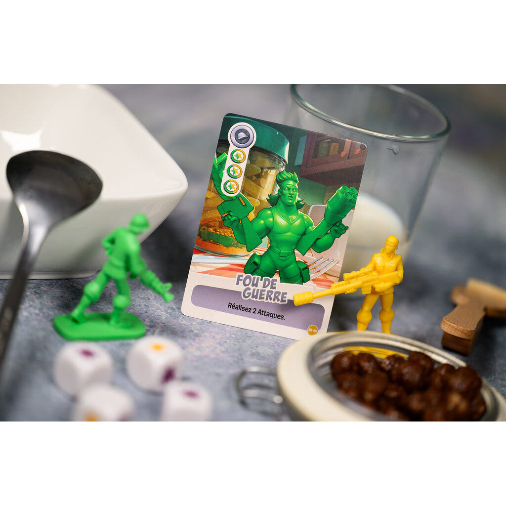 Dans Petits Soldats, deux armées de soldats en plastique s’affrontent sur la table, utilisant les assiettes, les verres et tout ce qui se trouve à proximité comme abri ou comme points d’observation. Déplacez vos personnages, attaquez vos ennemis, cachez-vous derrière le beurrier et utilisez vos cartes pour des actions spéciales.