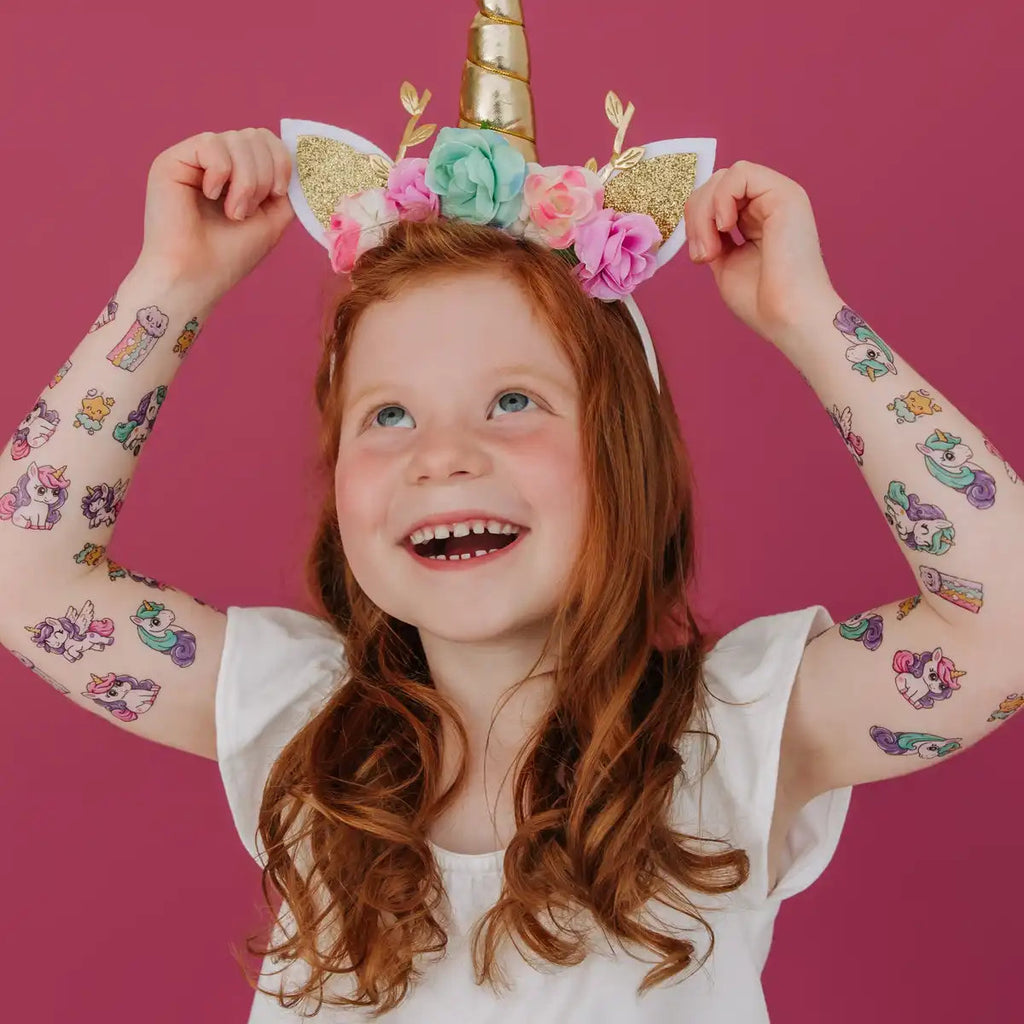 Les pouliches aux couleurs de l’arc-en-ciel sont prêtes à galoper et à s’amuser. Partout où elles passent, elles laissent derrière elles de beaux arcs-en-ciel aux couleurs pastels. Le petit cadeau parfait pour ceux qui aiment les licornes et leur monde magique. Procurez-vous également les tatouages Les licornes et La licornerie pour créer un bel ensemble amusant.