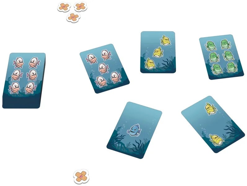Pour commencer, mélangez les cartes piranhas recto-verso et donnez-en une à chaque joueur, ainsi que cinq jetons de bandage. Placez la carte supérieure de la pioche au milieu de la table. À votre tour, placez votre carte sur la table, avec l'une ou l'autre face vers le haut, puis retournez toutes les autres cartes de la même couleur. Si au moins dix piranhas d'une même couleur sont visibles, cet essaim vous attaque, ce qui vous coûte des jetons en fonction de la taille du groupe de piranhas. Pigez une carte pour terminer votre tour.