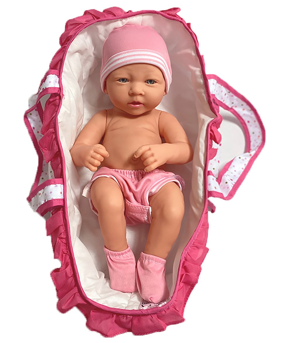 La poupée fille mesure 36 cm de longueur et est entièrement faite entièrement de vinyle. Elle a des yeux fixes, des cheveux moulés et des traits de visage peints. Elle est livrée avec un berceau de transport de 35x19x16cm pour la garder en sécurité.