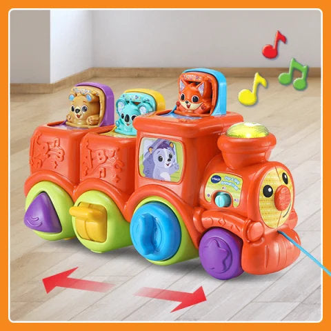 Les tout-petits peuvent tirer le train pour entendre des mélodies pendant qu'il se déplace, ce qui récompense les petits marcheurs et fait travailler la motricité globale; la corde à tirer se range sous le train