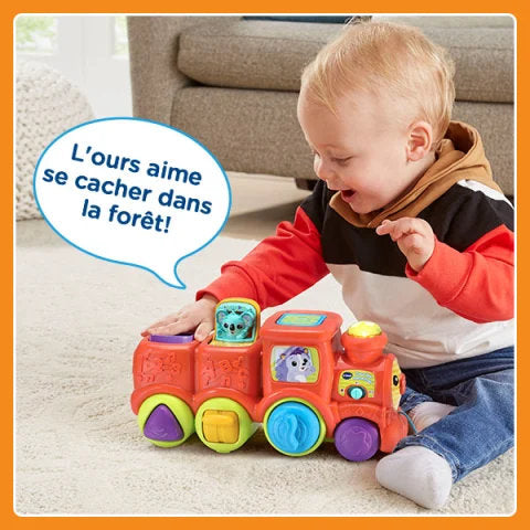 Tous à bord pour des surprises pop-up! Rejoignez les amis des animaux sur le Roul'train cache-cache des P'tits loulous. Explorez les fonctionnalités de fidget sur les roues pour faire travailler les petits doigts et expérimenter la cause et l'effet. Où se cachent les animaux? Appuyez, poussez, retournez et tournez pour les faire apparaître. Surprise! Écoutez des faits amusants sur l'ours, le koala et le renard et sur leur lieu de vie. Encouragez les tout-petits à pousser le train et à voir la cheminée clignoter au son de la musique. Lorsque les tout-petits sont prêts à marcher, ils peuvent le tirer pour entendre des effets sonores, des phrases amusantes et des chansons. C'est l'heure de roule! Tchou-tchou ! Conçu pour les enfants de 6 à 36 mois. Nécessite 2 piles AAA. Piles incluses à des fins de démonstration uniquement. Des piles neuves sont recommandées pour une utilisation régulière.