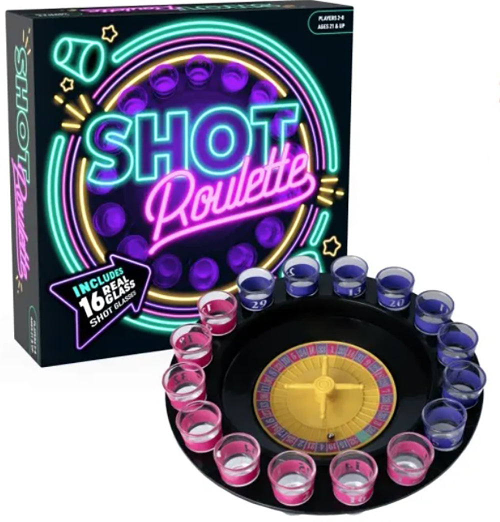 Jeu de roulette au milieu du plateau; peu importe sur quel verre à shooter la bille tombe, vous devez prendre le shooter!